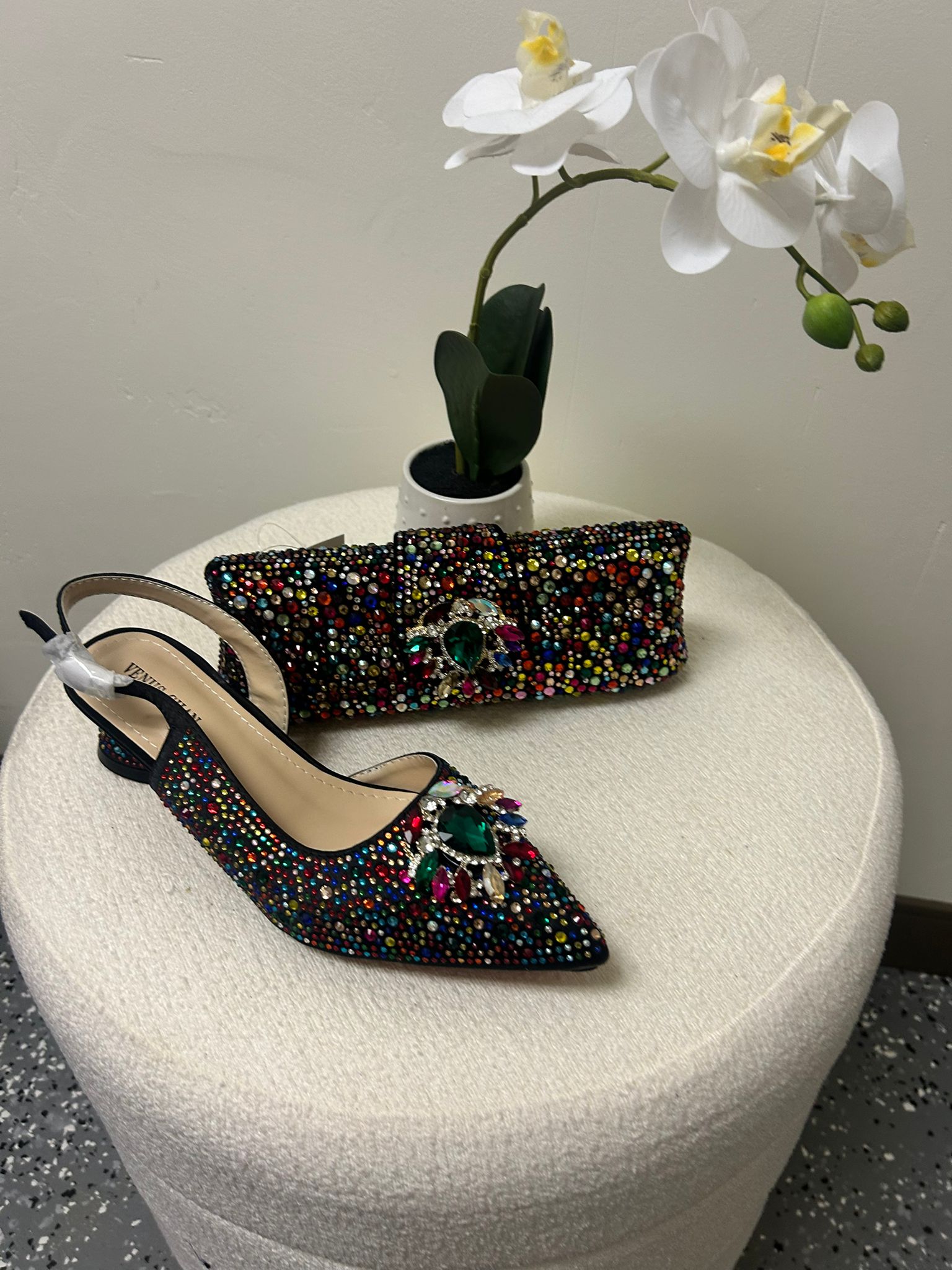 Elevate your ensemble with this Black Multi-color Bejeweled Heel & Clutch set, featuring a stunning signature stone that adds a refined touch of elegance. The multi-color embellishments on the heel and clutch create a captivating contrast against the sleek black base, perfect for making a sophisticated statement at any event. Designed for both style and comfort, this coordinated pair ensures you stand out with expert-level fashion finesse.
