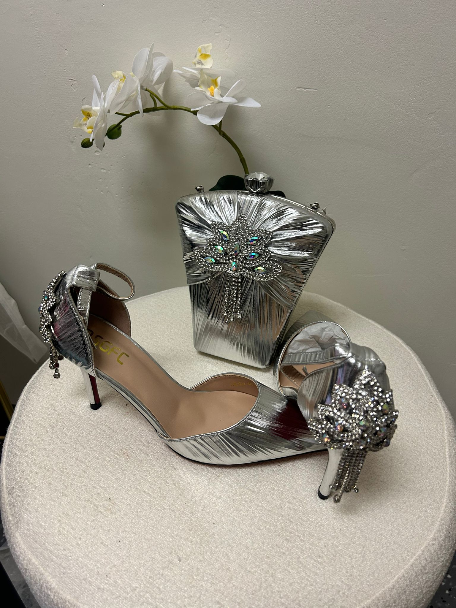 Experience timeless mid-20th century elegance with this Matching Art Deco Style Jeweled Bag and Shoe set. Expertly designed to complement each other, the shoe and purse feature coordinated emblems that capture the distinctive geometric beauty of the Art Deco era. Perfect for those who appreciate vintage sophistication, this set adds a refined touch to any ensemble.
